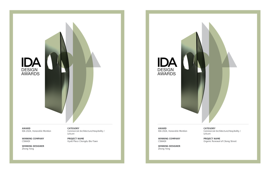 设计团队 郑勇、陈嘉乐、张宗腾,刘宇,续文琪,王依璇,李燚等 奖项介绍 美国国际设计大奖(International Design Awards,简称IDA)于2007年设立,是最受业界尊敬和最具权威的全球设计奖项之一,表彰、颂扬和推动具有传奇色彩的设计梦想者,发掘在建筑、室内、产品、平面设计和时尚设计方面的新兴人才,并致力于呼吁全球关注设计创新、概念化设计以及创造优质的作品。奖项评审团由五个学科(建筑、时尚、室内、产品和平面设计)的行业专家组成,评委在各自的设计领域有着极佳的才能和贡献。该奖项各学科设置金奖Gold、银奖Silver、铜奖Bronze及荣誉提名奖。