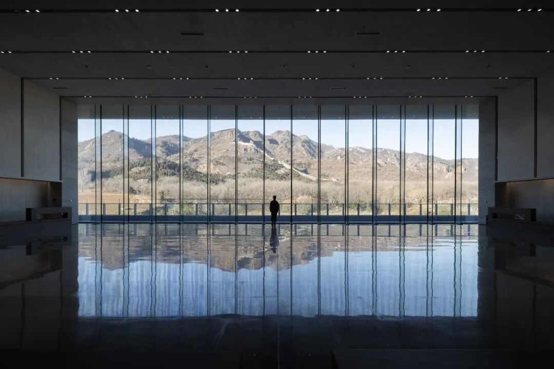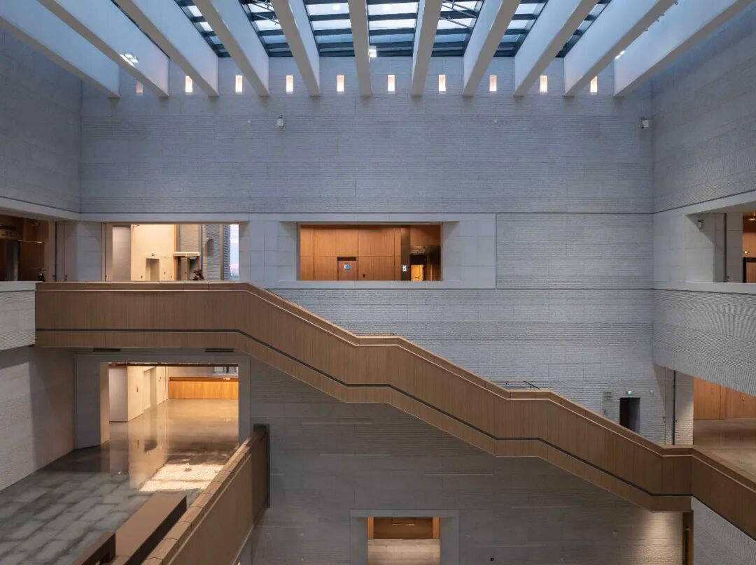 作为一座以长城文化为主题的国家一级专题性博物馆,项目在室内设计层面并未停留于符号化表达,而是通过对“城”的空间原型进行当代转译,构建具有叙事性的室内结构。设计以清晰的尺度控制与材料逻辑,将公共空间划分为三个彼此渗透的层次:以浅灰色粗粝花岗岩构成的中庭空间,确立空间的秩序与仪式感;以温润木质围合的回廊与休憩区域,缓和参观动线中的情绪体验;以及由灰色亚光石材形成、并与建筑外幕墙呼应的“景框”界面,在室内外之间建立连续的视觉关系。