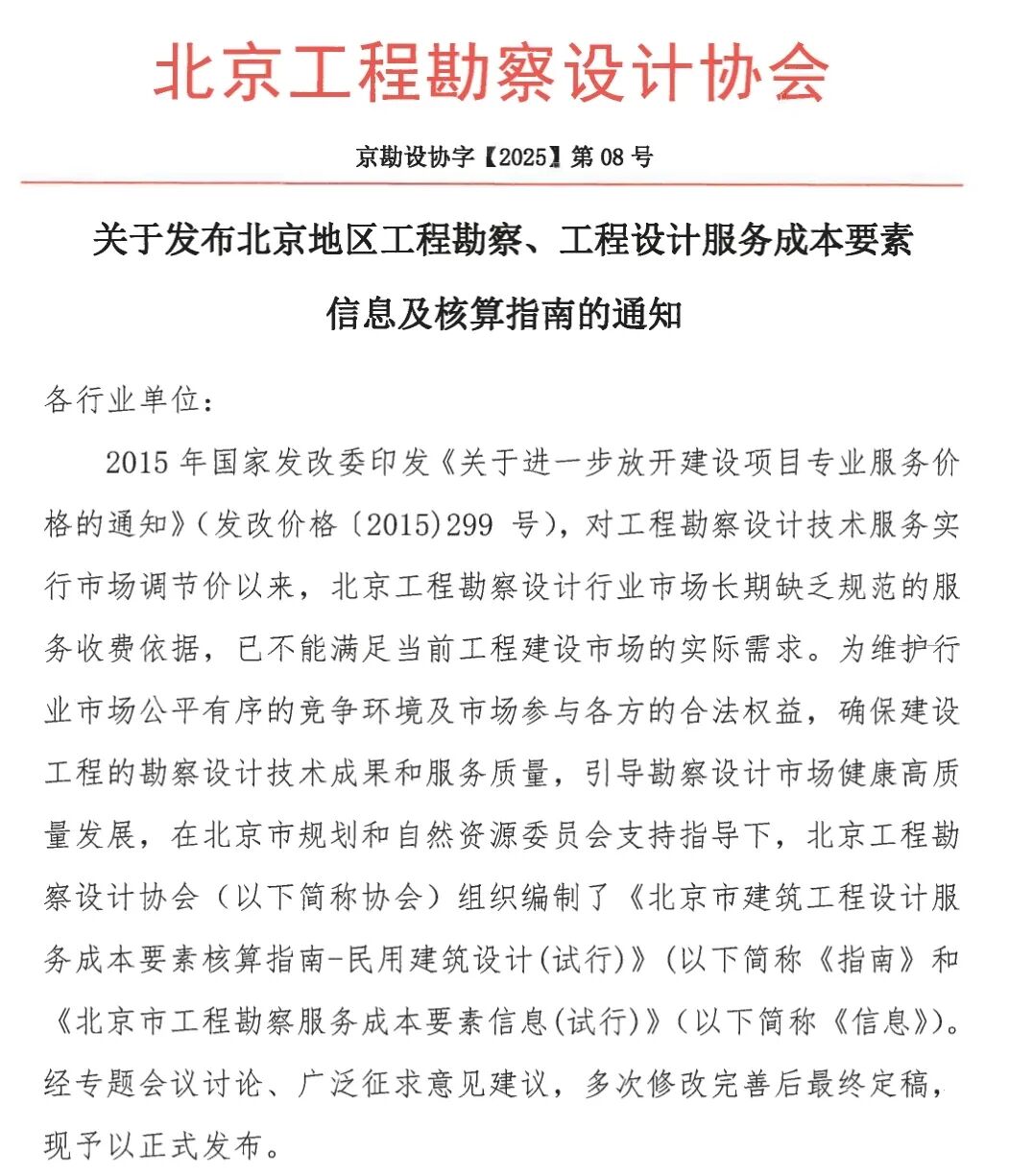 8月份,北京工程勘察设计协会针对行业市场长期缺乏规范的服务收费依据已不能满足当前工程建设市场的实际需求的问题,在北京市规划和自然资源委员会支持指导下,北京工程勘察设计协会(以下简称协会)组织编制了《北京市建筑工程设计服务成本要素核算指南-民用建筑设计(试行)》(以下简称《指南》和《北京市工程勘察服务成本要素信息(试行)》(以下简称《信息》)。