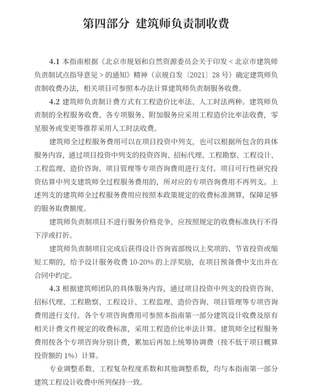 北京这次主要给出了建筑师负责制的计费方式,明确了两种:工程造价比率法与人工时法两种。也明确了哪些内容适用工程造价比率法,哪些内容适用人工时法,可以说很详尽了,具有重要的参考意义,建筑师负责制项目知道怎么收费了,进步了。