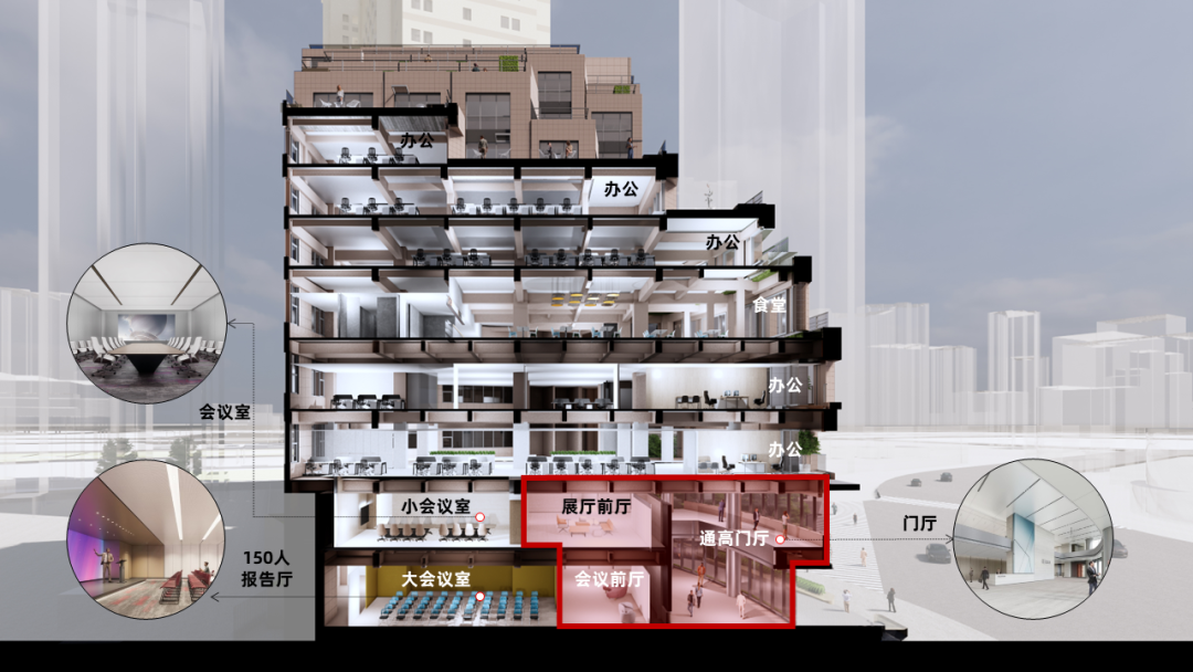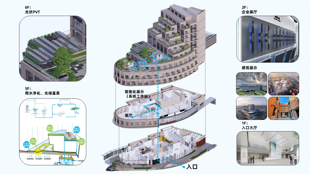 由内而外设置独立的参观流线,打造可视化的城市橱窗和立体展厅,一层入口门厅兼做临时展厅,通过大堂的两部电梯串联二层的前厅及展厅,满足不同类型的展览需要。新增的楼梯将五层、六层屋顶花园联系在一起,结合退台的建筑造型生动展示绿色技术的应用。