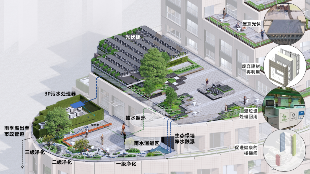 引入绿色低碳的理念,城市更新可持续设计从实际需求出发,从被动式遮阳、旧改再利用、近零废设计、光储直柔建筑等各方面出发,秉承“以人为本”的原则,打造真正舒适、经济、适用、节能的超低能耗办公建筑,成为既有建筑可持续更新的示范样板,向城市传递可持续价值。