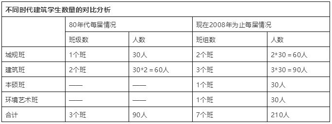 1、学校的规模及质量:三十年前,建筑学专业的毕业生来源主要是以老八校和建筑工程学院为主,当时的建筑学院,招生数量有限,要求严格,即便已被建筑院校录取,入校后还要再加试美术基础,如果考得不好,则需要转系,同时院方会从其他专业转入一些具有美术基础的学生来补足名额。由此,当时建筑院校的生源普遍具备较好的美术功底,各建筑院校毕业生之间整体水平接近且质量较高。三十年后的今天,建筑市场空前兴盛,受此影响,各高校争相创办建筑学院系,建筑院校如同“雨后春笋”层出不穷,加上国家的扩招政策,导致建筑院校的规模以及生源数量空前壮大,下表为某重点大学建筑学院80年代学生数量与2008年学生数量的对比。