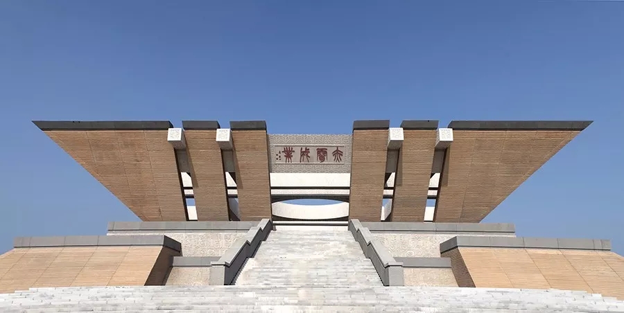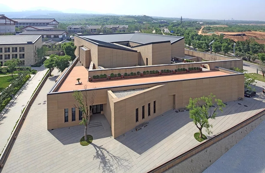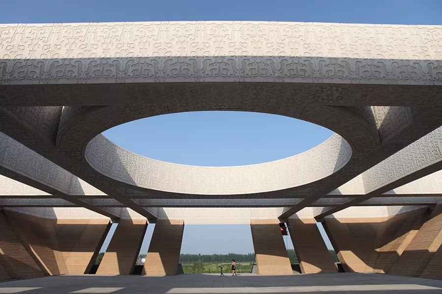 祭祀大殿主体为交叉梁系平面桁架大跨结构,外饰混凝土挂板、平面为四方“坛城”式布局,抽象而写意地概括了汉代文化的拙朴大美与震撼厚重,不仅深层次表达了祭祀场所的应有意境也成为景区重要的精神符号。方形的平面与顶部的圆形构图,表现了天圆地方的朴素哲理,土黄色仿夯土肌理的混凝土挂板,点缀灰白色汉代纹样,虚实相生,大道至简。