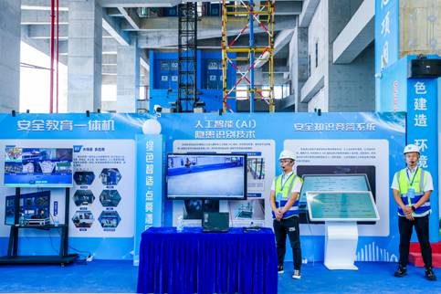 雨污水回收利用系统、智能水电监管系统、扬尘监测+智能自动化喷雾降尘系统等绿色施工措施,处处贯彻绿色建造理念;智慧建造机器人、智慧制砖机与墙面抹灰机、无人机巡检、AI图像识别的应用让观摩人员耳目一新。