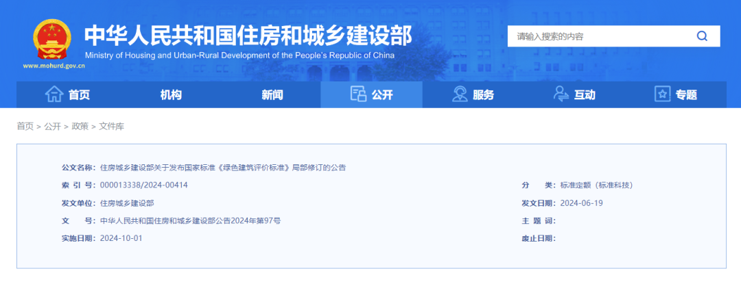 现批准国家标准《绿色建筑评价标准》(GB/T50378-2019)局部修订的条文,自2024年10月1日起实施。