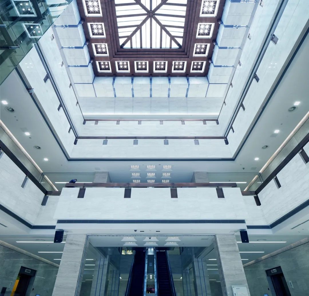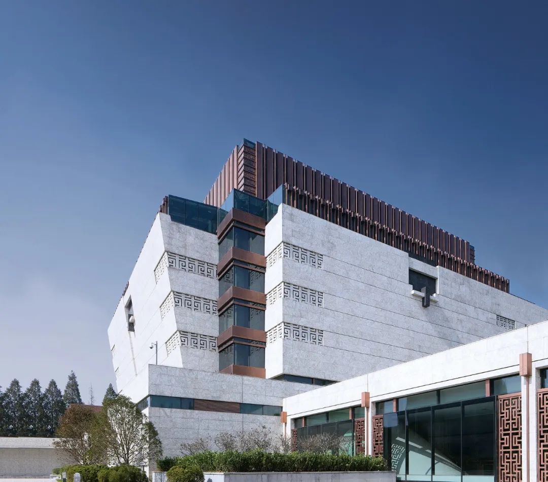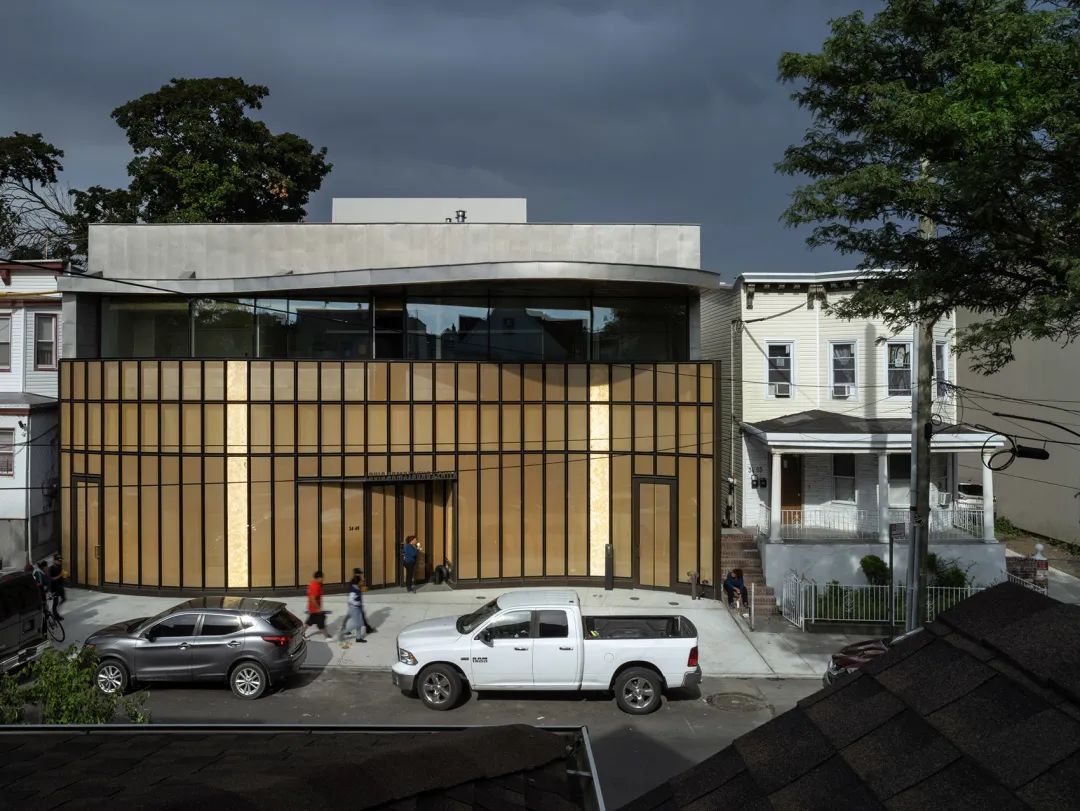 整个顶灯分为三层,最里层为梅花和桂花图案,分别代表着中国风骨和杭州风韵;外环为青花瓷色调薄膜灯,朵朵簇拥;最外层由108个“流线型紫铜连心斗拱”巧妙地呈三阶叠层,每阶36拱,首尾相扣,代表着团结联动的强大力量。室内外还选用了大量性的紫铜板,铜板的质朴、厚重与典雅既与整体的设计氛围相吻合,又能与仿辽式老大殿的琉璃瓦屋顶取得协调。新设计的展馆室内中庭空间处理借鉴了老大殿“藻井”的手法,吊顶的梁格采用了紫铜板,形成了既简约现代又古朴典雅的现代建筑“藻井”,使得恢弘的大厅空间有了自己的个性,而且还调整了玻璃的进光量。地点:纽约 / 设计:Caples Jefferson Architects新路易斯·阿姆斯特朗中心位于皇后区科罗纳,是一个集合教育、娱乐与研究的场所。在高大的双层玻璃体量内,一层黄铜材质的织网在白天反映出街区的景象,在夜晚则成为指示着演出的灯塔。黄铜的色彩反映了阿姆斯特朗经常使用的乐器,并且重复出现在起伏的顶棚下方,以及室内成对分布的立柱的题词上。文学之家