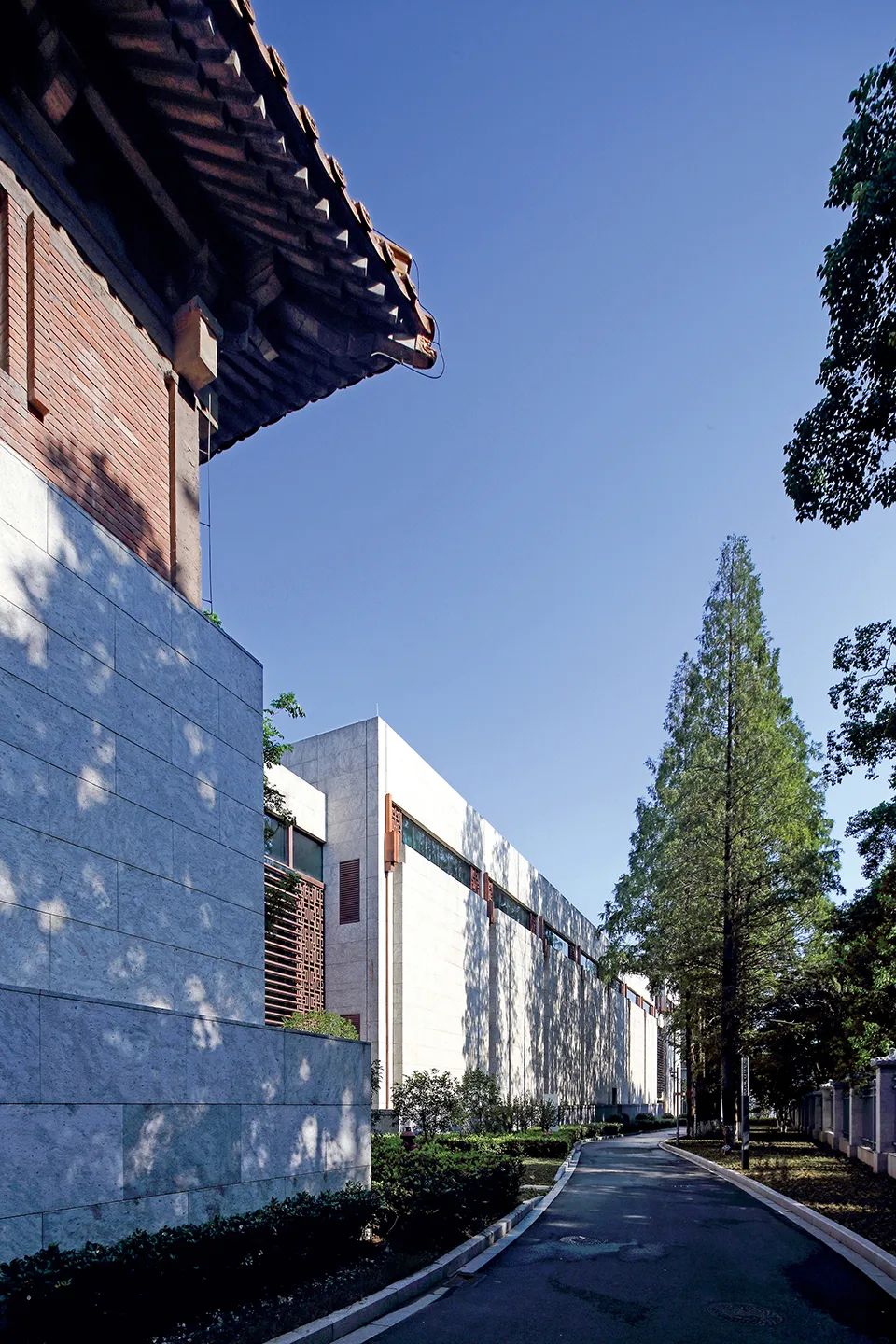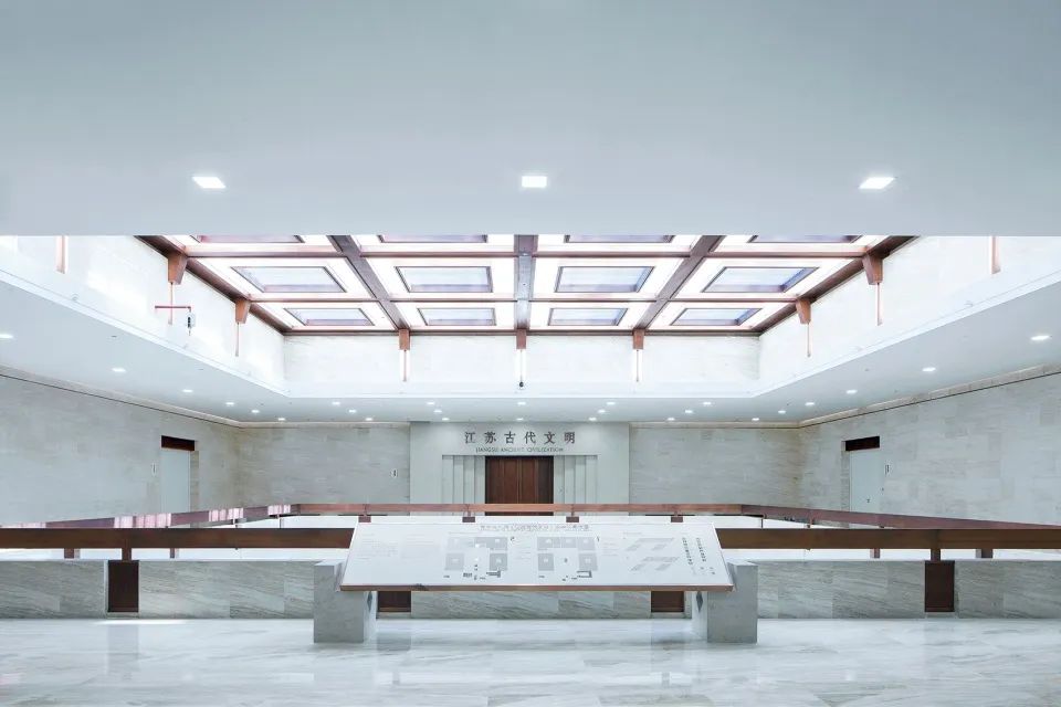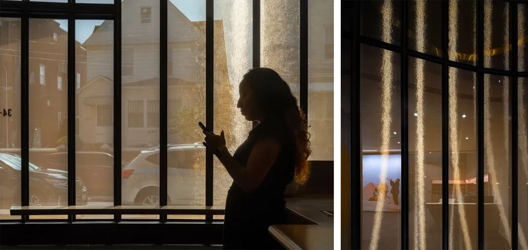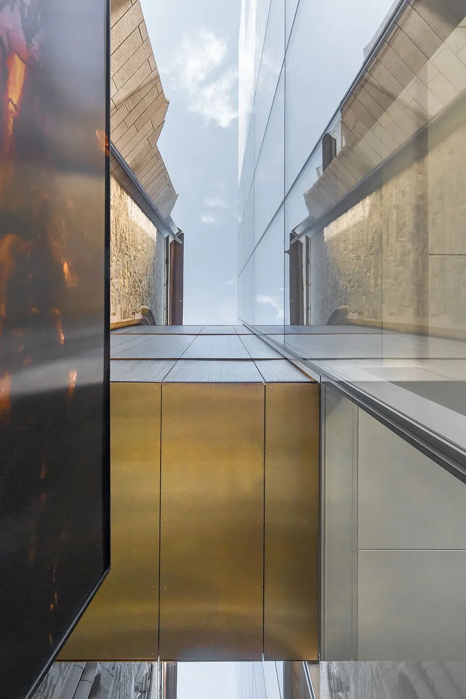 整个顶灯分为三层,最里层为梅花和桂花图案,分别代表着中国风骨和杭州风韵;外环为青花瓷色调薄膜灯,朵朵簇拥;最外层由108个“流线型紫铜连心斗拱”巧妙地呈三阶叠层,每阶36拱,首尾相扣,代表着团结联动的强大力量。室内外还选用了大量性的紫铜板,铜板的质朴、厚重与典雅既与整体的设计氛围相吻合,又能与仿辽式老大殿的琉璃瓦屋顶取得协调。新设计的展馆室内中庭空间处理借鉴了老大殿“藻井”的手法,吊顶的梁格采用了紫铜板,形成了既简约现代又古朴典雅的现代建筑“藻井”,使得恢弘的大厅空间有了自己的个性,而且还调整了玻璃的进光量。地点:纽约 / 设计:Caples Jefferson Architects新路易斯·阿姆斯特朗中心位于皇后区科罗纳,是一个集合教育、娱乐与研究的场所。在高大的双层玻璃体量内,一层黄铜材质的织网在白天反映出街区的景象,在夜晚则成为指示着演出的灯塔。黄铜的色彩反映了阿姆斯特朗经常使用的乐器,并且重复出现在起伏的顶棚下方,以及室内成对分布的立柱的题词上。文学之家