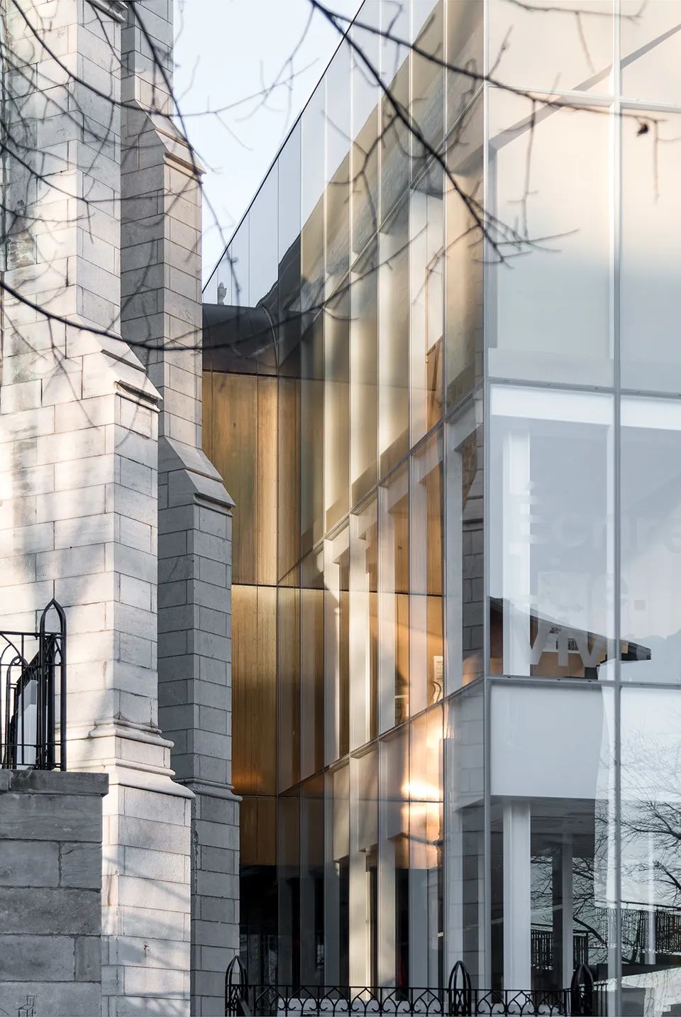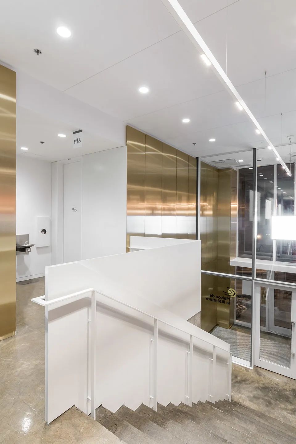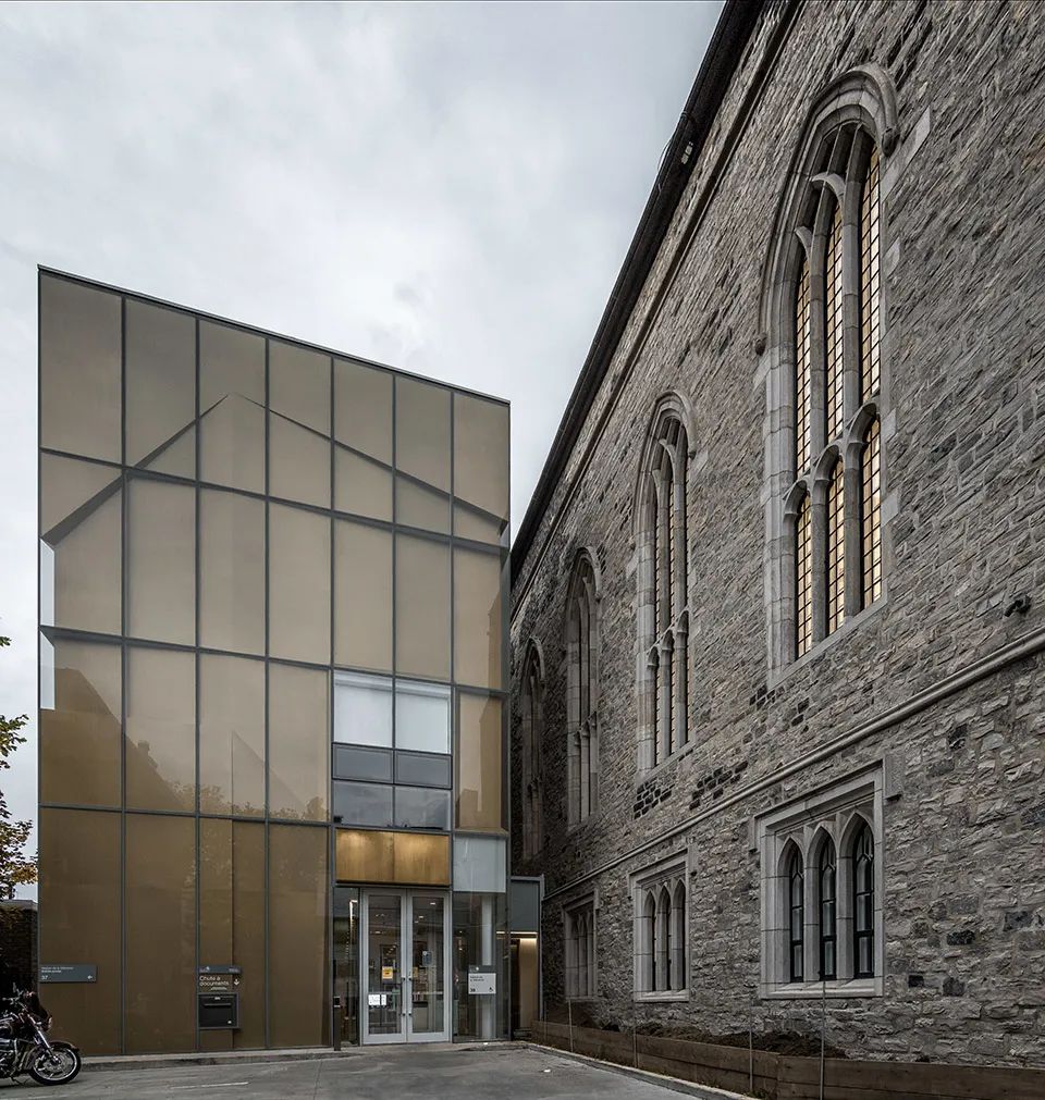 地点:魁北克 / 设计:Chevalier Morales ArchitectesMaison de la littérature (文学之家)位于历史悠久的老魁北克街区,主入口从与St-Stanislas街相交的倾斜Chaussée des Écossais底部自然而然地引导人们进入室内。立面外壳由玻璃板和底部的穿孔黄铜板构成,形成有趣的浅浮雕形象。A.