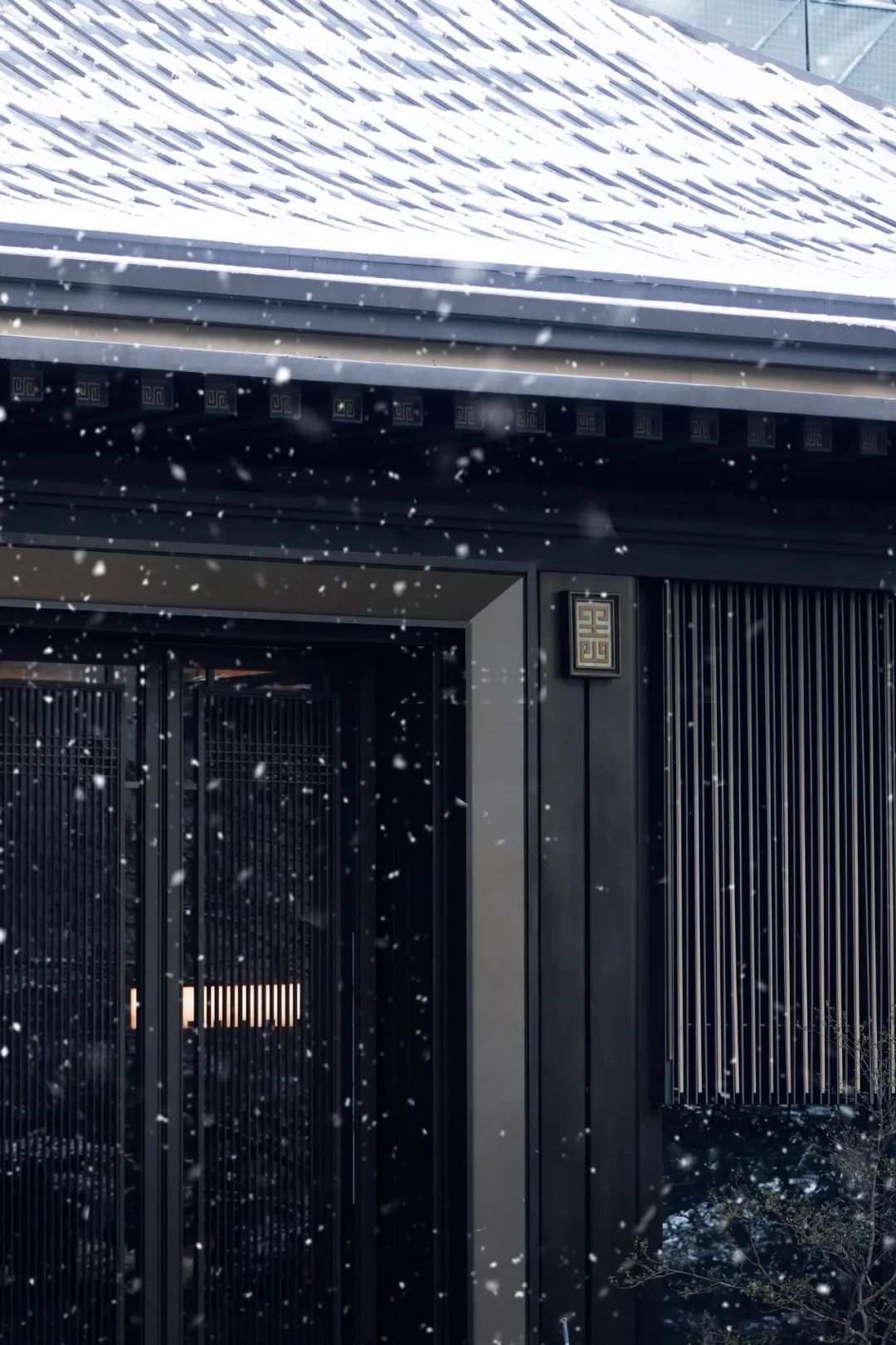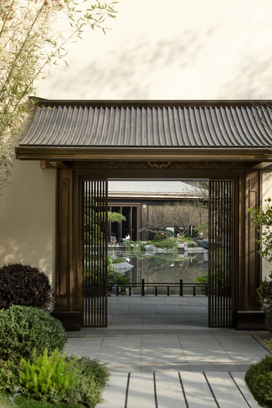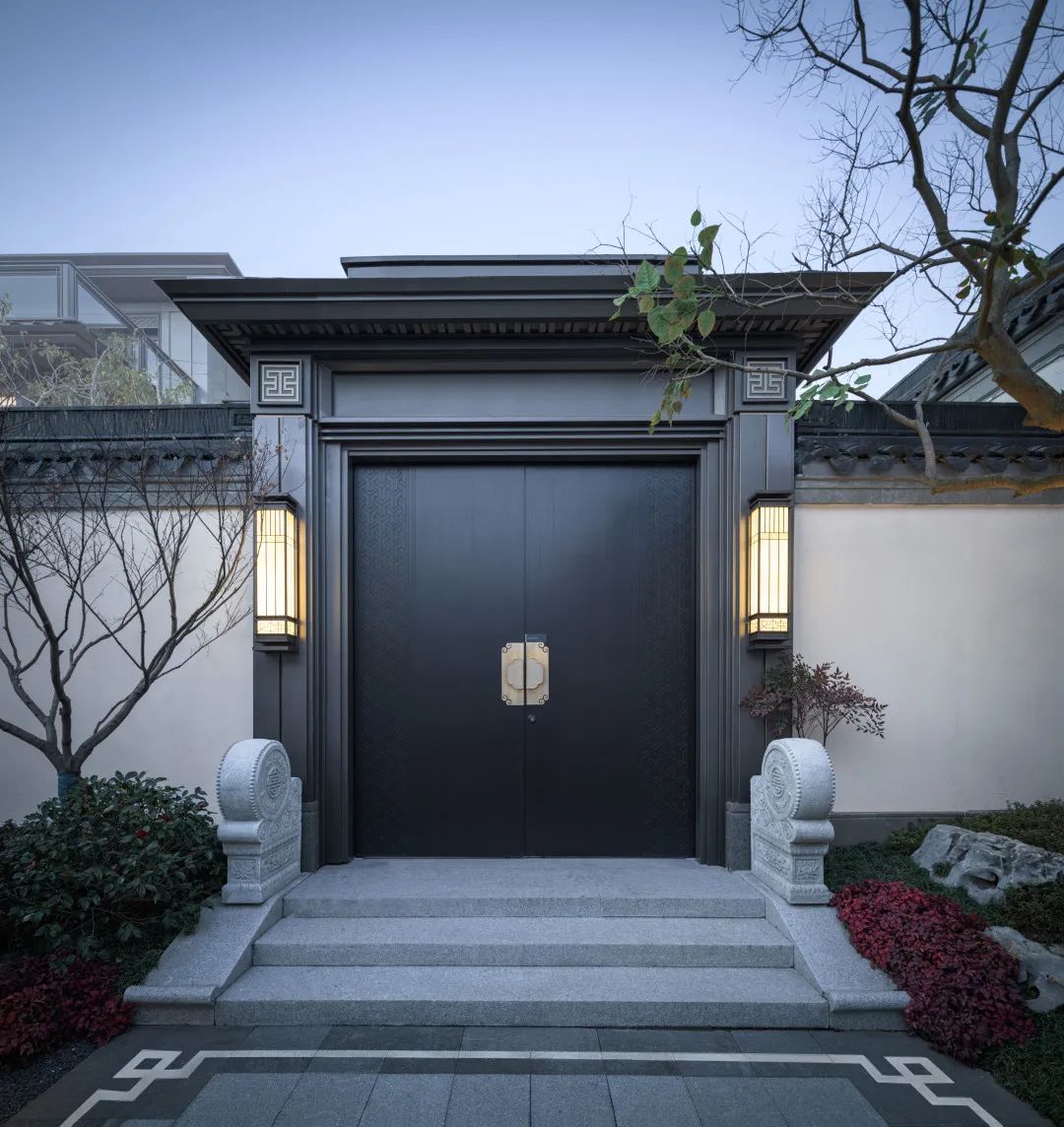 项目大门采用歇山顶与“王府大门形制”为门面,传统斗拱结构,层层叠加,秩序井然,材料多用仿铜材质。招摇松植,枝枝挺拔,两侧影壁铺陈开来,顾盼有景,游之不厌,搭配绿岛跌水,娓娓道来简净脱俗的东方情致。B.